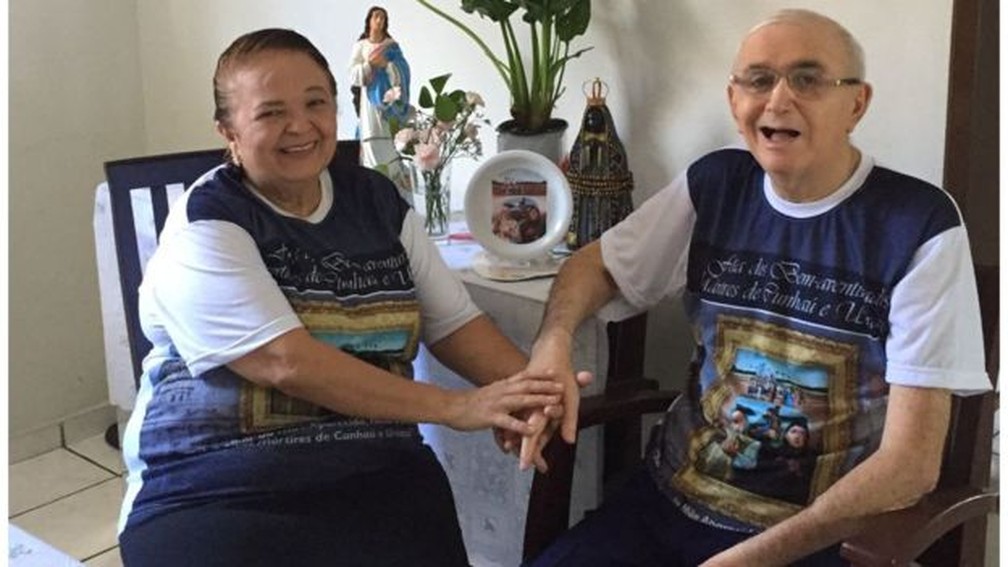 Sônia e Robério Nogueira: Militar aposentado descobriu tumor no cérebro em 2002 e atribui "milagre da sobrevida" aos mártires (Foto: BBC/Arquivo Pessoal)