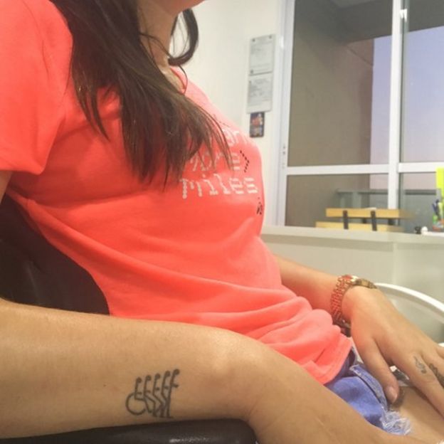 Laís tem uma tatuagem no braço que mostra seu sonho: o de levantar da cadeira